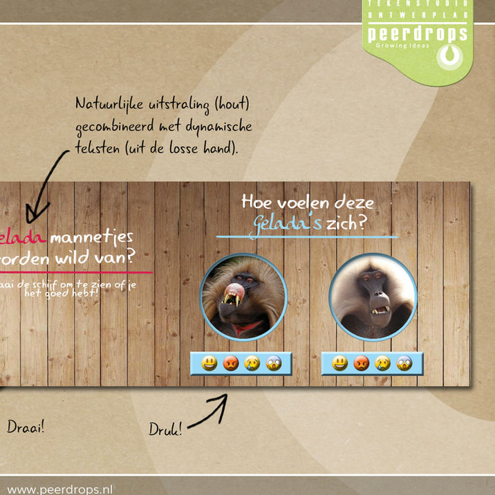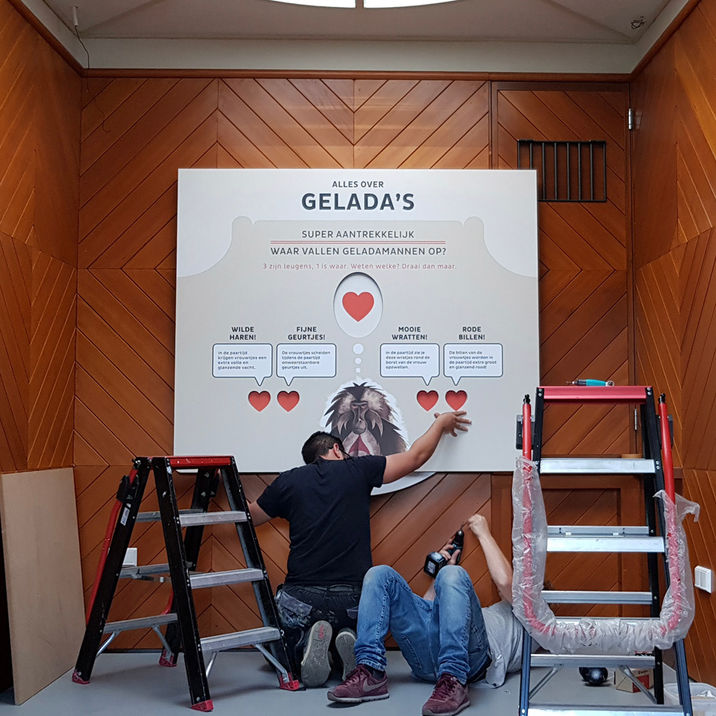 Dat we educatie mochten ontwikkelen voor in het monumentale pand van de gelada's, vonden we heel bijzonder. We hebben ons daarom ook echt laten inspireren door de prachtige uitstraling van dit bijzondere gebouw. Eerst wel even bij moeders nagevraagd met welke stroming we nou te maken hadden - Art Deco dus - en gewapend met deze kennis de ontwerpen gemaakt. Resultaat zijn een 5-tal interacties die én mooi bijdragen aan, en matchen met, de vibe van het gebouw, én ook gewoon de Peerdropsfactor bevatten. Het mooiste voorbeeld hiervan is de Billenbank; een object waar kinderen met hun billen een geladabillenquiz kunnen doen 😁